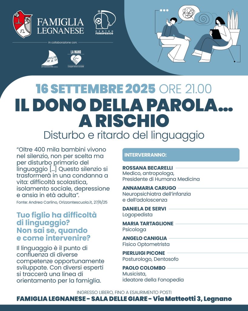 La Famiglia Legnanese, in collaborazione con Centro Fonopedico e Humana Medicina, organizza una serata dedicata al disturbo e al ritardo del linguaggio: “Il dono della parola … a rischio”.